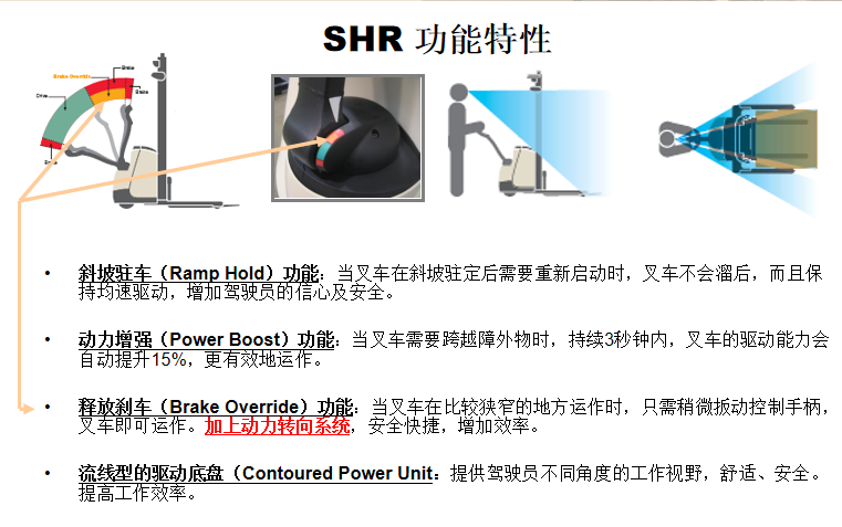 操作輕松簡單 ——單手即可操作重達4000磅(1590kg)的貨物。制動超越功能方便在極其狹小空間內進行作業(yè),手柄幾乎處于垂直位置。低位動力裝置、清晰的門架設計(帶嵌套式導軌)和高效的液壓軟管布置提供了良好的視野,便于快速安心地搬運高位貨物。