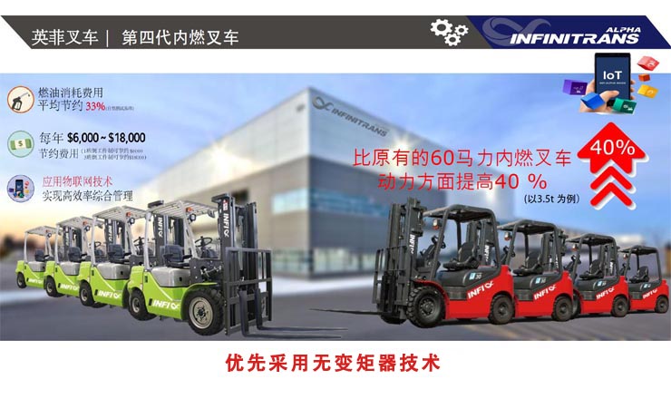 一、相比市場上同噸位內(nèi)燃叉車,英菲叉車動力提升40%,燃油節(jié)省33%