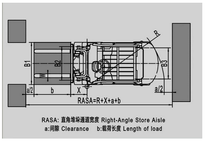 直角堆垛通道寬度是叉車進(jìn)入工作場(chǎng)地后能否有足夠空間作業(yè)的重要指標(biāo)。通俗點(diǎn)講就是叉車直行進(jìn)入兩個(gè)障礙物(比如兩排貨架)之間,然后旋轉(zhuǎn)90度后進(jìn)行叉取貨物時(shí),兩個(gè)障礙物之間的距離。理論上直角堆垛通道寬度越小越好,可以節(jié)省貨物的擺放空間,但實(shí)際上這個(gè)指標(biāo)跟很多參數(shù)有關(guān),計(jì)算值只做為參考。