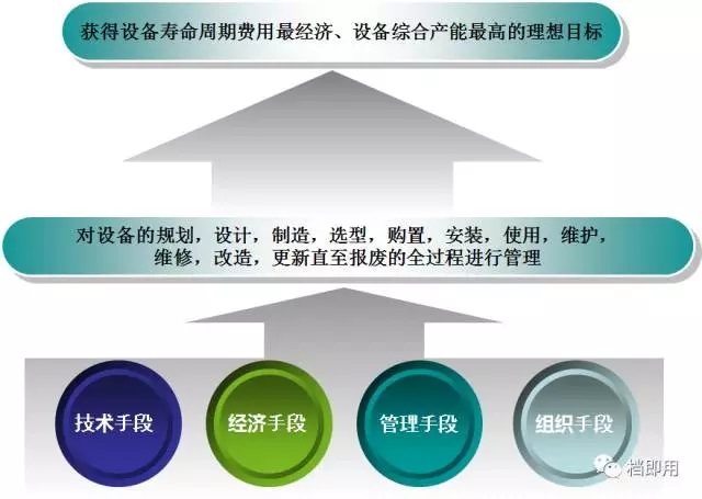 以生產(chǎn)經(jīng)營為目標(biāo),通過一系列的技術(shù),經(jīng)濟(jì),組織措施,對(duì)設(shè)備的規(guī)劃、設(shè)計(jì)、制造、選型、購置、安裝、使用、維護(hù)、維修、改造、更新直至報(bào)廢的全過程進(jìn)行管理,以獲得設(shè)備壽命周期費(fèi)用最經(jīng)濟(jì)、設(shè)備綜合產(chǎn)能較高的理想目標(biāo)。
