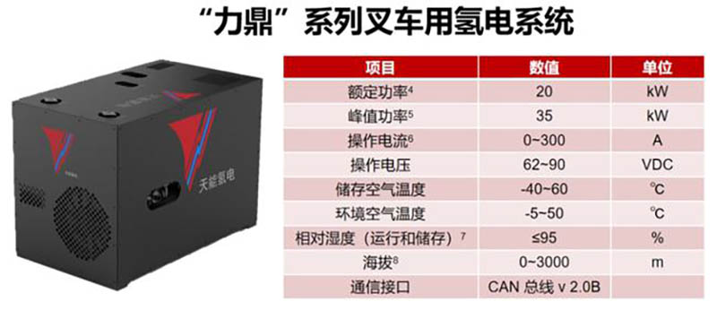 此次天能氫能源與徐工特機(jī)合作打造的適用于叉車(chē)專用的“力鼎”燃料電池系統(tǒng),額定輸出20kW,峰值輸出可達(dá)35kW,燃料電池電堆設(shè)計(jì)壽命可達(dá)10000h,兼容市面上大部分鉛酸或鋰電電動(dòng)叉車(chē)。產(chǎn)品在徐工叉車(chē)上進(jìn)行配置應(yīng)用后呈現(xiàn)“體積小,零碳排,加氫3分鐘、工作5小時(shí)”的特點(diǎn),有效解決了新能源叉車(chē)產(chǎn)品的續(xù)航問(wèn)題。