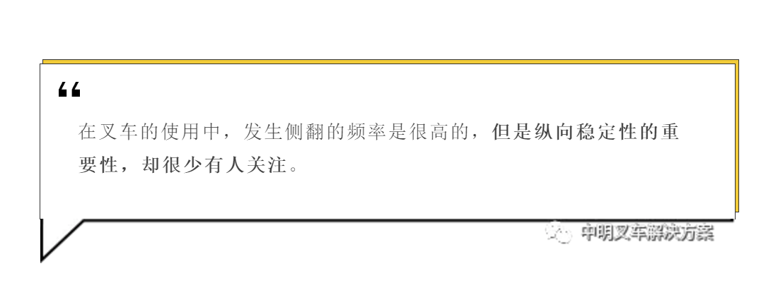 叉車的縱向穩(wěn)定性,是考查叉車抵抗向前傾翻的能力,主要是堆垛。一個物體是否穩(wěn)定,取決于這個物體在系統(tǒng)一端產(chǎn)生的重力矩是大于、等于還是小于這個物體在該系統(tǒng)另一端產(chǎn)生的重力矩。載荷到叉車支點的矩等于叉車在支點另一端產(chǎn)生的矩,那么整個車輛是平衡的并且不會移動。否則,如果在支點一端的力矩大,車輛將會移向力矩大的一端。載荷產(chǎn)生的力矩小于叉車重量產(chǎn)生的力矩時,叉車是穩(wěn)定的,不會向前傾翻;載荷產(chǎn)生的力矩大于叉車重量產(chǎn)生的力矩時,較大的載荷力矩將迫使叉車向前傾翻。